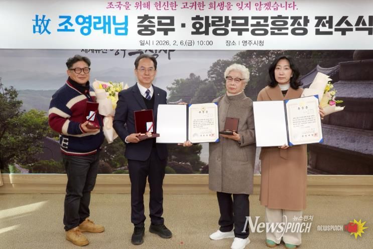 뉴스펀치 박세훈 기자 | 영주시는 지난 6일, 6·25전쟁 참전유공자 고(故) 조영래 상병의 유족에게 충무무공훈장과 화랑무공훈장을 전수하며, 전쟁의 혼란 속에서 전달되지 못했던 국가의 영예를 77년 만에 되돌려주었다.
