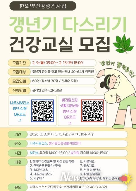 뉴스펀치 김윤걸 기자 | 전남 나주시보건소가 갱년기 증상을 겪고 있는 중장년의 건강 증진을 위해 ‘2026년 상반기 갱년기 다스리기 건강교실’ 참여자를 모집한다.
