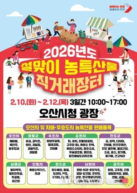 뉴스펀치 박상훈 기자 | 오산시는 설 명절을 맞아 오는 2월 10일부터 12일까지 3일간, 오전 10시부터 오후 5시까지 오산시청 광장에서 자매·우호도시와 함께하는 ‘설맞이 농특산물 직거래장터’를 개최한다고 밝혔다.