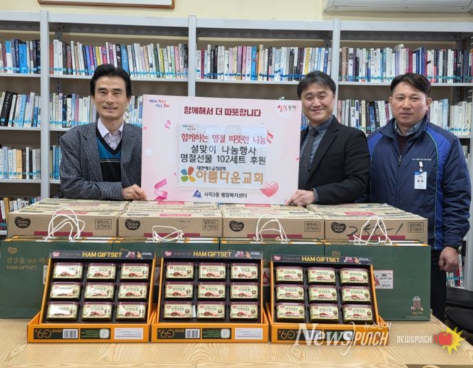 뉴스펀치 김윤걸 기자 | 부산 동래구 사직3동 행정복지센터는 지난 4일 사직3동 소재 대한예수교장로회 아름다운교회(담임목사 김성식)로부터 설날을 맞아 어려운 이웃들을 위한 명절 선물 세트 102개(이백만 원 상당)를 전달받았다고 밝혔다.