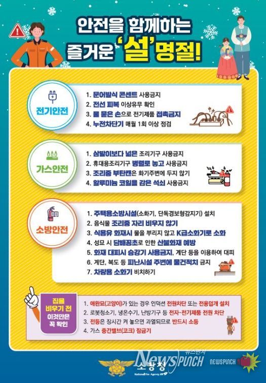 특히 설 명절 기간에는 귀성·귀경 및 가족 모임으로 인해 전기장판, 전기히터, 멀티탭 사용량이 급증하고, 장시간 사용으로 과열 위험이 커지는 만큼 문어발식 콘센트 사용 금지, 손상된 전선 즉시 교체, 누전차단기 정상 작동 여부 점검이 중요하다고 강조했다.