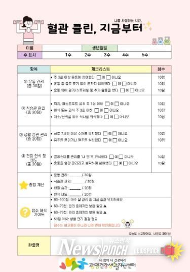 뉴스펀치 박상훈 기자 | 광명시 광명건강생활지원센터가 시민들의 만성질환 예방과 자가 건강관리 역량 강화를 위해 ‘혈관 클린, 지금부터’ 프로그램을 운영한다.