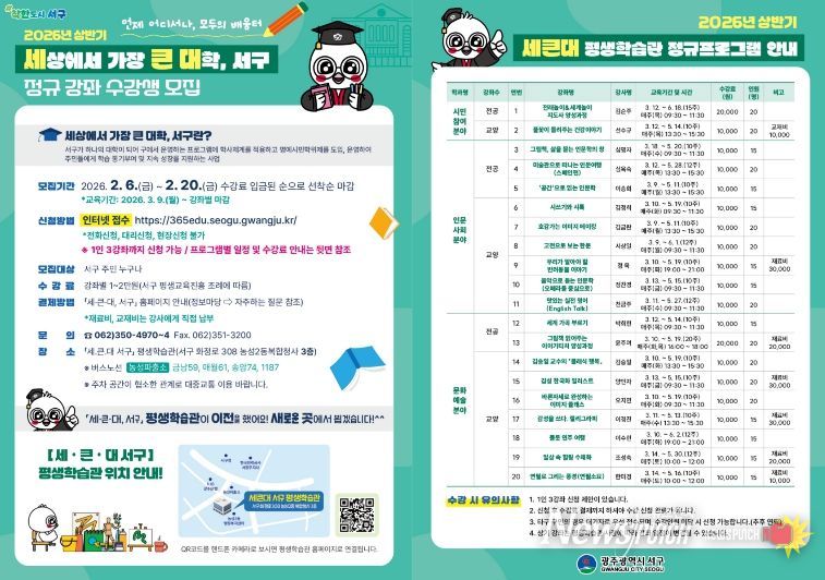 뉴스펀치 김용희 기자 | 광주광역시 서구는 ‘세상에서 가장 큰 대학, 서구(이하 세큰대)’ 상반기 정규강좌 수강생을 모집한다.