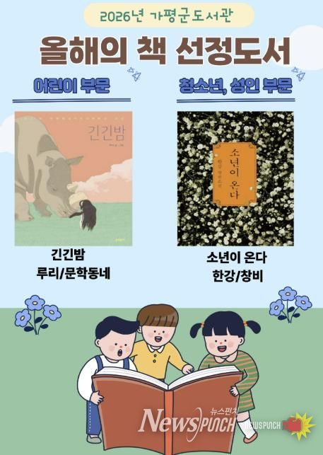 뉴스펀치 박상훈 기자 | 가평군도서관이 군민의 독서 문화 확산을 위해 ‘2026년 올해의 책’으로 루리 작가의 『긴긴밤』과 한강 작가의 『소년이 온다』를 선정했다.
