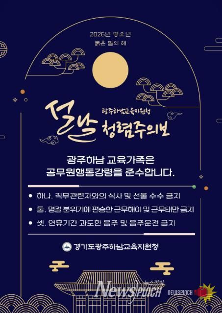 뉴스펀치 박상훈 기자 | 경기도광주하남교육지원청은 2월 9일, 2026년 병오년 설명절을 맞아 관내 교직원들이 청렴한 마음가짐으로 새해를 시작할 수 있도록‘교육장 청렴서한문’과‘청렴주의보’를 각급 학교에 전달했다.