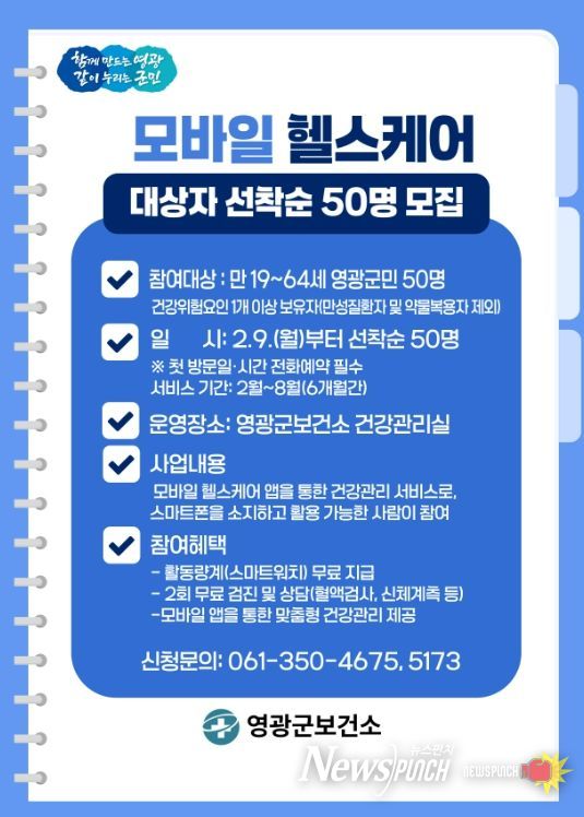 뉴스펀치 박세훈 기자 | 영광군보건소는 오는 2월 9일부터 모바일헬스케어 사업 1기 참여자 50명을 선착순 모집한다고 밝혔다.