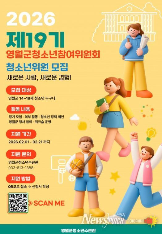 뉴스펀치 조평훈 기자 | 영월군청소년수련관은 관내 중~고등학교 청소년을 대상으로 오는 21일(토)까지 영월군청소년참여기구 신규, 연임 위원을 추가 모집한다.