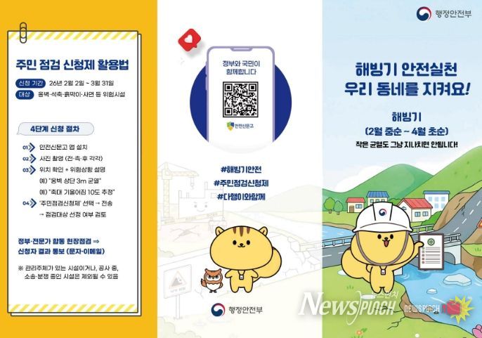 시 관계자는 "해빙기에는 옹벽과 석축, 사면 등에서 안전사고 위험이 커진다"라며 "생활 주변에 위험이 우려되는 시설물이 있으면 주민점검신청제를 적극적으로 활용해 주길 바란다"라고 말했다.
