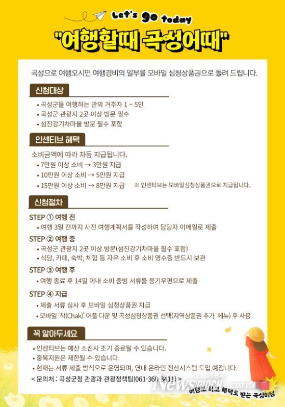 뉴스펀치 최영남 기자 | 전남 곡성군이 여행 중 소비한 금액에 따라 최대 8만 원을 돌려주는 관광 인센티브 지원사업‘여행할때 곡성어때’를 운영한다고 6일 밝혔다.