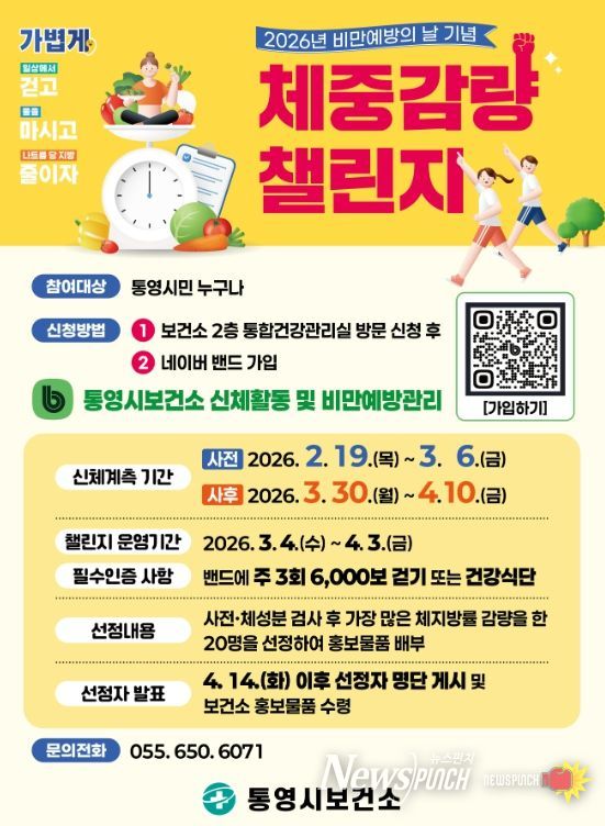 뉴스펀치 박세훈 기자 | 통영시는 오는 3월 4일 비만예방의 날을 맞이해 ‘체중감량 챌린지’를 실시한다고 6일 밝혔다.