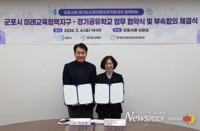 뉴스펀치 박상훈 기자 | 군포의왕교육지원청과 군포시청은 2월 6일 군포시청에서 '2026 군포시 미래교육협력지구-경기공유학교 업무협약식 및 부속합의서'를 체결했다.