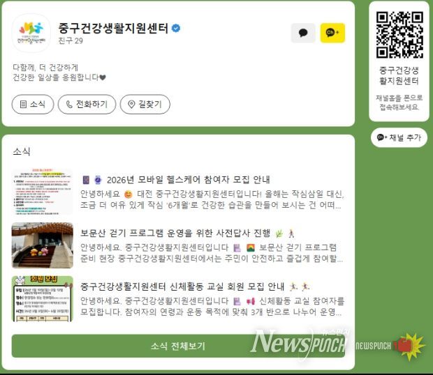뉴스펀치 이현승 기자 | 대전 중구는 주민들에게 보다 폭넓고 신속한 건강 정보와 중구건강생활지원센터에서 추진하는 각종 사업 정보를 제공하기 위해 카카오톡 채널을 개설・운영한다고 8일 밝혔다.
