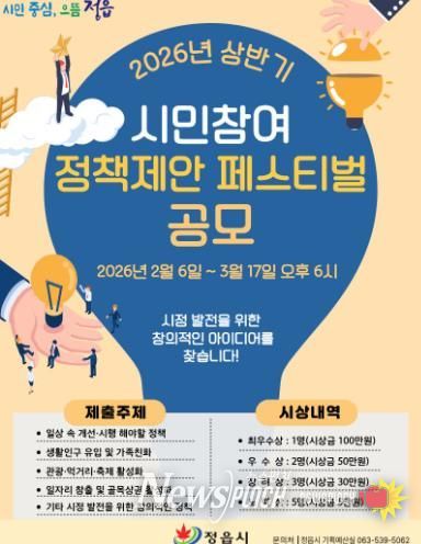 뉴스펀치 정홍균 기자 | 정읍시가 시민의 생생한 목소리를 시정에 반영하고 실생활에 도움이 되는 참신한 정책을 발굴하기 위해 ‘시민 정책 제안 공모전’을 개최한다.
