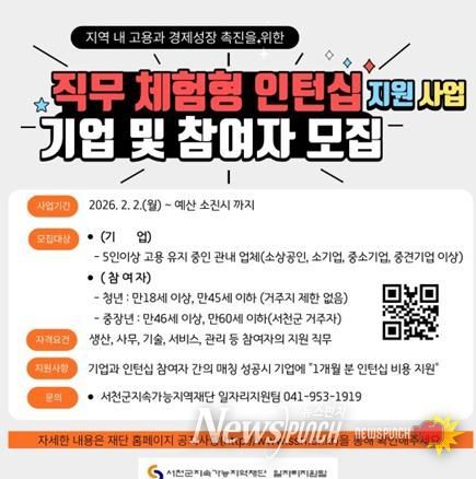 뉴스펀치 이현승 기자 | 서천군지속가능지역재단 일자리지원팀이 오는 2월 2일부터 서천군 관내에서 5인 이상 고용 유지 중인 소상공인, 소기업, 중소기업 등을 대상으로 “직무 체험형 인턴십 사업”을 본격 추진한다고 밝혔다.