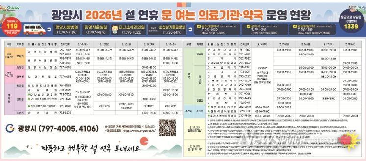 연휴 동안 지역 응급의료기관인 ▲광양사랑병원 ▲광양서울병원 등 2개소는 응급실을 24시간 비상체제로 운영하며, 관내 병·의원 105개소, 보건의료기관 6개소, 휴일지킴이 약국 46개소가 문을 열어 의료 서비스를 제공한다.