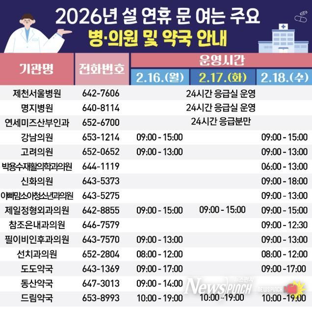 먼저 24시간 응급실을 운영하는 명지병원과 제천서울병원 등 응급의료기관 2개소를 핵심 거점으로 지정해 중증 환자 발생에 대비한다. 이와 함께 경증 환자가 가까운 곳에서 신속히 진료받을 수 있도록 병의원 109개소와 약국 52개소를 일자별로 지정 운영해 의료 공백을 최소화할 계획이다.