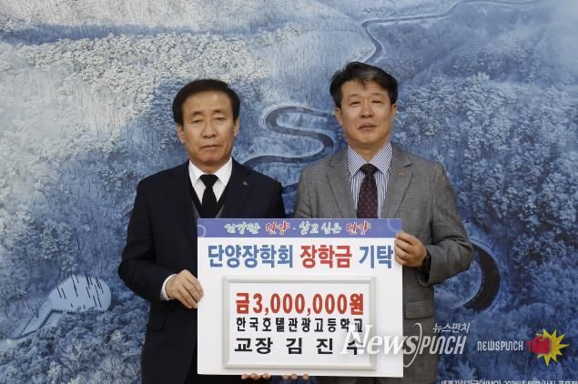 뉴스펀치 이현승 기자 | 단양장학회는 지난 9일, 한국호텔관광고등학교 김진수 교장이 군수실에서 장학금 300만 원을 기탁했다고 밝혔다.