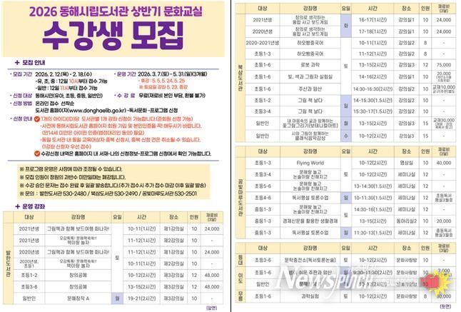 먼저, 동해시립도서관은 2026년 상반기 문화교실 수강생을 모집한다.