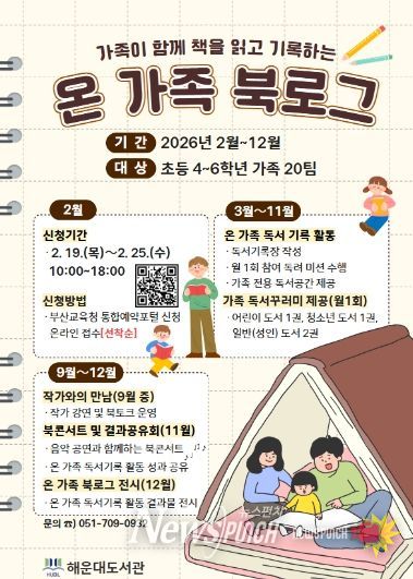 뉴스펀치 김윤걸 기자 | 부산광역시립해운대도서관(관장 노장석)은 2월부터 12월까지 초등학교 4~6학년 자녀를 둔 가족 20팀을 대상으로 가족 독서 기록 ‘온 가족 북로그’를 운영한다.