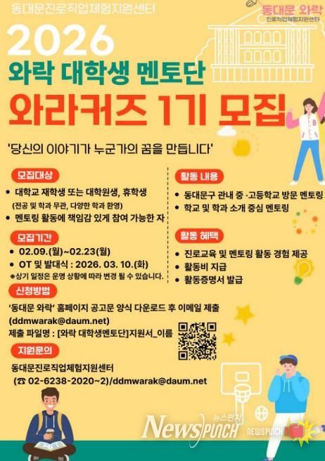 뉴스펀치 박상훈 기자 | 동대문구가 위탁 운영하는 진로직업체험지원센터 와락은 동대문구 청소년들의 진로 탐색을 지원하기 위해 멘토단 '와라커즈(WARAKERS)' 1기를 공개 모집한다. 와라커즈(WARAKERS)는 ‘와락(WARAK)’과 ‘-ers’를 결합한 명칭으로, 와락과 함께 청소년의 진로 성장을 이끌어가는 사람들을 의미한다.