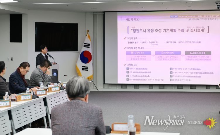 유성구는 지난 9일 오후 대회의실에서 ‘정원도시 유성 조성 기본계획 수립 및 실시설계’ 중간보고회를 열고, ▲첨단과 자연의 융합도시 구축 ▲미래형 도시 인프라 조성 ▲지속가능한 정원공동체 형성 등 3대 목표와 실행 전략을 제시했다.