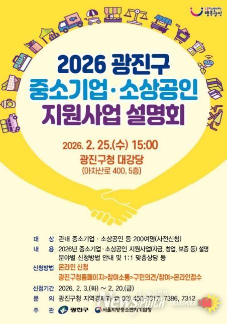 뉴스펀치 박상훈 기자 | 광진구가 2월 25일 광진구청 대강당에서 서울지방중소벤처기업청과 함께 ‘2026 광진구 중소기업‧소상공인 지원사업 설명회’를 개최한다.