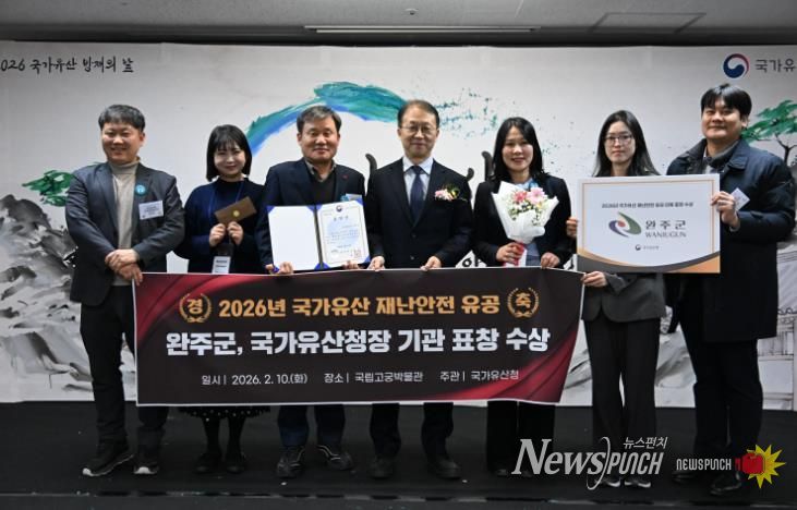 뉴스펀치 정홍균 기자 | 완주군이 10일 서울 국립고궁박물관에서 전국 시군 중 유일하게 ‘2026 국가유산 재난 안전 유공’ 국가유산청장 기관 표창을 수상했다.