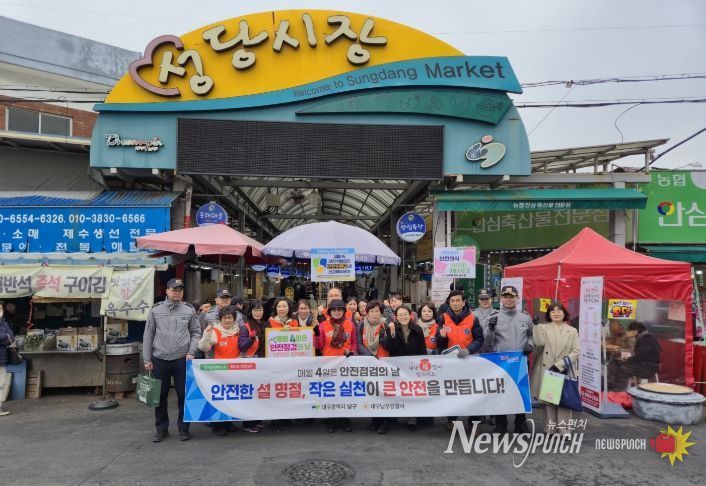 뉴스펀치 조평훈 기자 | 대구 남구는 2월 10일 대명4동 청춘골목 조성지 일원의 성당시장에서 설 명절을 앞두고 지역 주민의 안전의식을 높이기 위한 안전문화운동 캠페인을 실시했다.