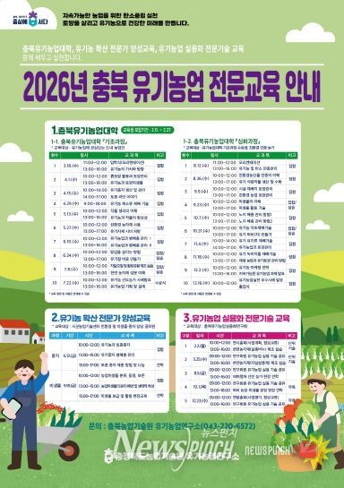 뉴스펀치 이현승 기자 | 충북농업기술원은 유기농업 전문인력양성을 위해 ‘2026년 충북유기농업대학’ 교육생을 2월 11일부터 27일까지 모집한다. 모집 대상은 충북 지역에 거주하며 유기농업 실천을 희망하는 농업인으로, 기초과정과 심화과정에서 각각 50명을 선발할 계획이다.