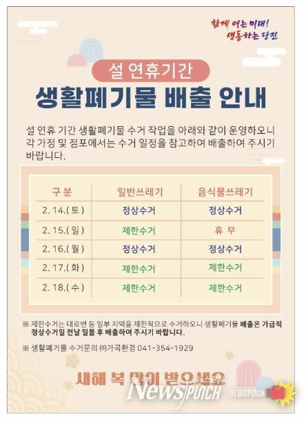 시에 따르면 설 연휴 기간인 2월 14일부터 2월 18일까지 일반쓰레기와 음식물쓰레기 수거가 일부 조정된다.