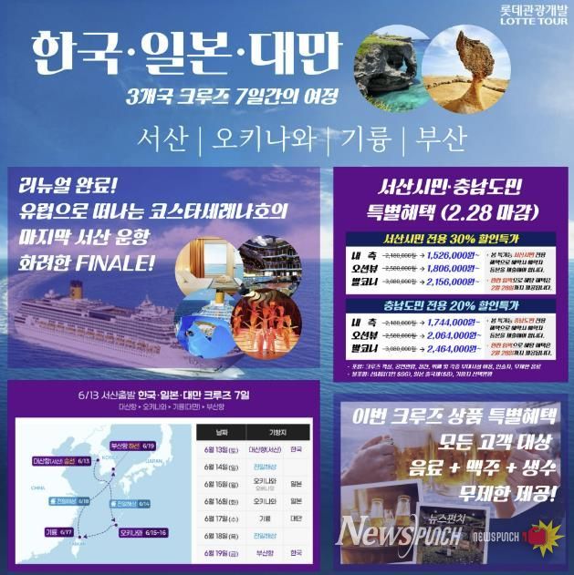 롯데관광개발 관계자는 “지역민이 가까운 서산 대산항을 통해 세계적인 크루즈 여행을 즐길 수 있는 특별한 기회”라며 “프로모션 마감 전 많은 시민이 혜택을 누리시길 바란다”라고 말했다.
