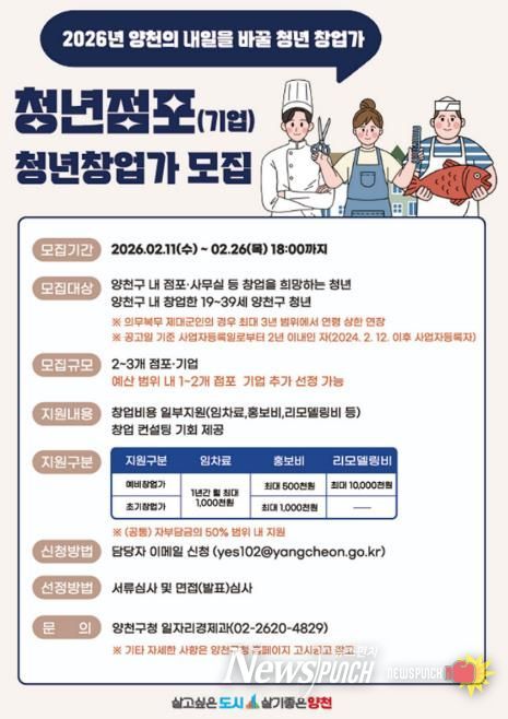 뉴스펀치 박상훈 기자 | 양천구는 창업을 희망하는 청년의 경제적 부담을 줄이고 초기 창업자의 안정적인 정착을 돕기 위해 ‘2026년 청년점포 육성사업’을 추진하고, 오는 26일까지 참여자를 모집한다고 밝혔다.