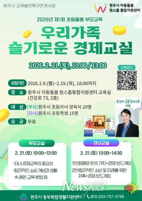 뉴스펀치 조평훈 기자 | 원주시 아동돌봄 원스톱통합지원센터는 2월 21일 초등생 가족을 위한 무료 경제 교육인'우리 가족 슬기로운 경제 교실'을 운영한다.