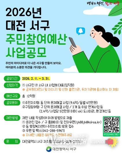 뉴스펀치 이현승 기자 | 대전 서구는 이달 11일부터 다음 달 31일까지 주민참여예산 공모사업에 관한 주민들의 제안을 받는다.