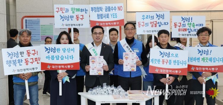 이번 캠페인은 박희조 동구청장을 비롯해 감사실과 대전동구공무원노동조합이 함께한 가운데, 명절 전후 자칫 느슨해질 수 있는 공직자의 청렴 의식을 강조하고 투명한 공직사회 분위기를 조성하기 위해 추진됐다.