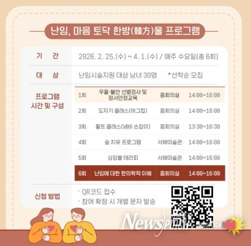 1기는 오는 2월 25일부터 4월 1일까지 매주 수요일 진행될 예정이며, 시는 30명을 선착순 모집할 계획이며, 신청을 원하는 난임시술지원 대상자는 오는 24일까지 서산시보건소 누리집에 게시된 홍보물의 QR코드를 통해 하면 된다.