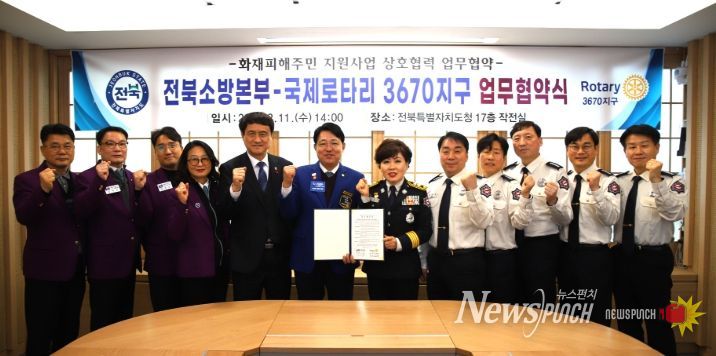 뉴스펀치 최영남 기자 | 전북특별자치도소방본부는 11일 국제로타리 3670지구(총재 김성희)와 화재피해주민 지원사업의 원활한 추진을 위한 상호협력 업무협약을 체결했다고 밝혔다.