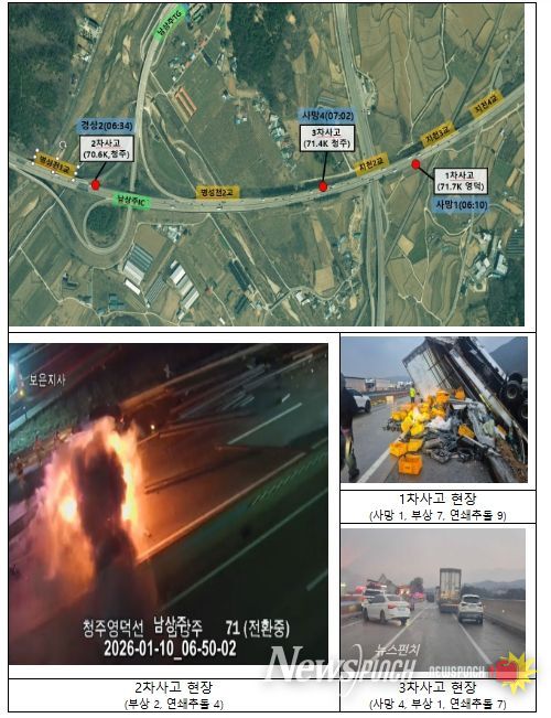 주요 지적사항으로는,한국도로공사 보은지사의 경우, ’26. 1. 10. 당시 사고 구간에 사고 발생 이전부터 강우로 인해 노면이 젖어 있었고, 노면온도가 영하로 떨어질 것으로 예보되어 도로 살얼음 발생이 예상되는 상황이었음에도, 기상 상황에 대한 판단 착오로 사고 구간에 제설제 예비살포를 실시하지 않은 것으로 나타났다.