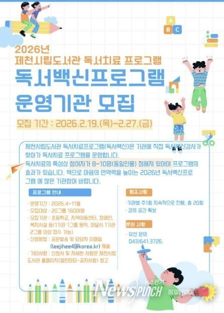 뉴스펀치 이현승 기자 | 제천시립도서관은 2026년 독서치료 프로그램 ‘독서백신 프로그램’을 운영할 기관을 오는 19일부터 27일까지 모집한다.
