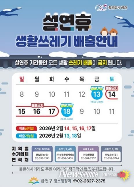 뉴스펀치 박상훈 기자 | 금천구는 설 연휴 기간 생활쓰레기(일반생활쓰레기, 음식물쓰레기, 재활용품) 수거를 일시 중단한다고 밝혔다.