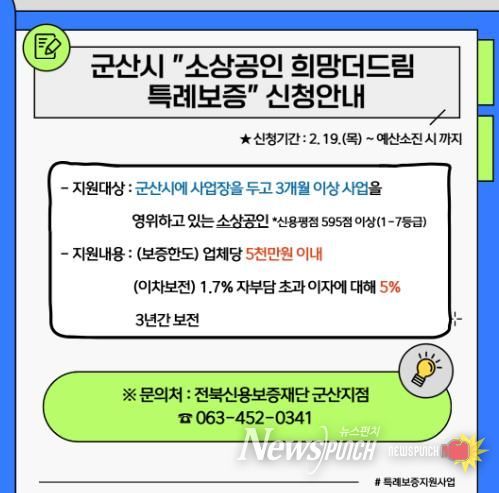 뉴스펀치 정홍균 기자 | 군산시가 장기화된 경기 침체와 고물가로 어려움을 겪고 있는 관내 소상공인들의 자생력 강화와 경영 안정을 위해 ‘2026년 소상공인 특례보증 지원사업’을 본격적으로 시행한다.