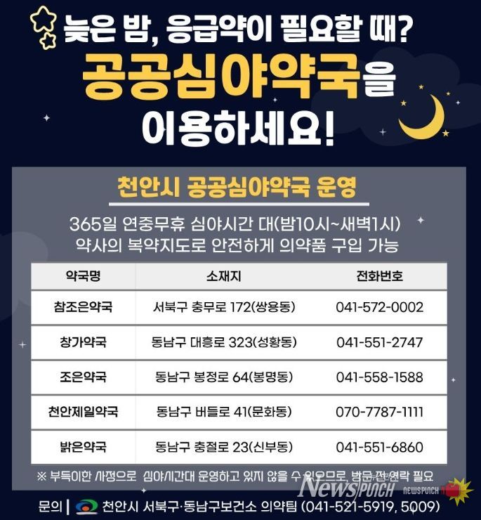 공공심야약국은 △참조은약국(쌍용동) △창가약국(성황동) △조은약국(봉명동) △천안제일약국(문화동) △밝은약국(신부동)이다.