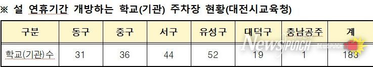 뉴스펀치 이현승 기자 | 대전시교육청은 설 연휴 기간인 2월 14일부터 18일까지 대전을 찾는 귀성객과 지역 주민의 주차 편의를 위해 관내 각급 학교와 교육청, 산하기관 등 총 183곳의 주차장을 무료로 개방한다고 밝혔다.