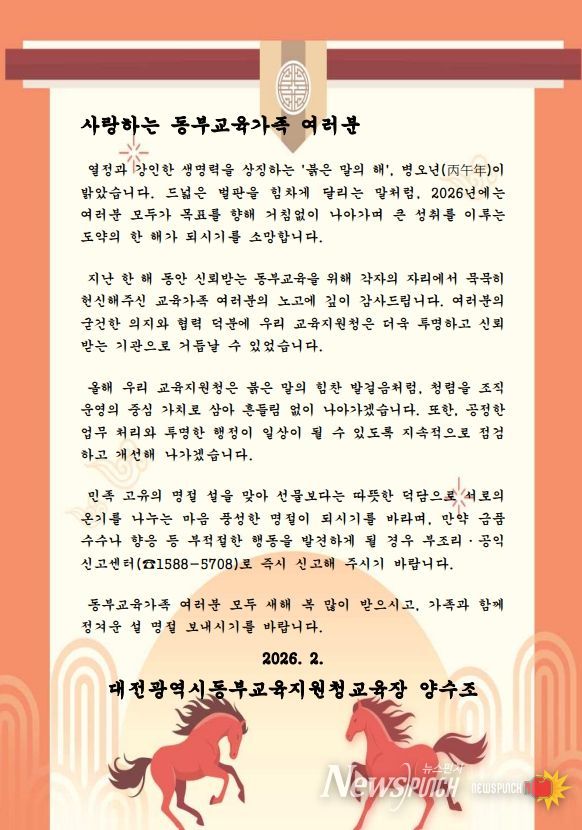 뉴스펀치 이현승 기자 | 대전동·서부교육지원청은 설 명절을 맞이하여 청렴 실천의지를 담은 교육장 서한문을 관내 유·초·중학교 및 교육지원청 교직원들에게 발송했다고 밝혔다.