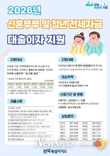 뉴스펀치 최영남 기자 | 전북특별자치도는 도민들의 주거비 부담을 완화하고 안정적인 정착을 지원하기 위해 저소득층 대상 임대보증금 무이자 융자, 신혼부부와 청년을 위한 전세자금 대출이자 지원, 공공임대주택 보증금 지원 등 '주거비 지원 3종 세트'를 올해부터 대폭 확대 시행한다고 12일 밝혔다.