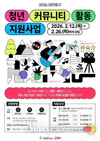 뉴스펀치 이현승 기자 | 대전 동구는 공통 관심사를 가진 청년들의 자발적인 모임 활동을 지원하는 ‘2026년 청년커뮤니티 활동지원 사업’을 본격 추진하며, 이달 12일부터 26일까지 참여자를 모집한다고 밝혔다.