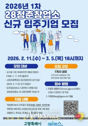 뉴스펀치 박상훈 기자 | 고양특례시가 조성하고 고양산업진흥원이 운영하는 ‘28청춘창업소’가 오는 3월 5일까지 2026년 1차 신규 입주기업을 모집한다.