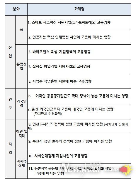 이날 회의에서는 2026년도 평가대상 후보과제에 대해서도 심의가 이뤄졌는데, 그간 고용 및 산업 전문가, 관계부처, 자치단체 등의 의견수렴 등을 거쳐 11개 후보과제가 발굴되었고, AI 등 유망산업분야(5개), 외국인 고용 등 인구구조분야(2개), 청년일자리・사회적 경제 등 지역정책분야(4개) 등 일자리에 영향을 미치는 주요 정책과제들로 확정되었다.