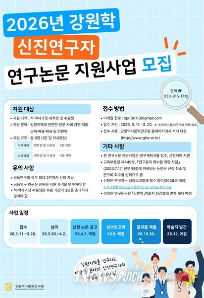 뉴스펀치 조평훈 기자 | 강원역사문화연구원은 강원학 연구 활성화를 도모하고 강원학 전문 인재 양성을 위해 신진연구자를 대상으로 한 ‘강원학 연구논문 지원사업’을 진행한다.