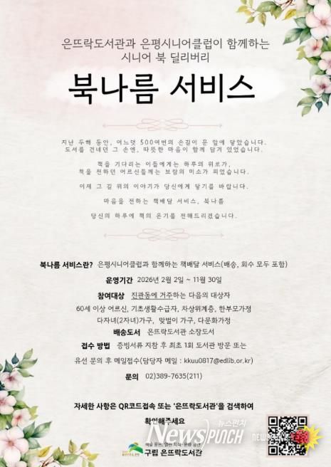 김미경 은평구청장은 “북나름 서비스 확대 운영을 통해 더 많은 주민이 일상 속에서 책을 가까이할 수 있게 됐다”며 “어르신 일자리와 지역 돌봄을 함께 아우르는 사업으로 지속 발전시켜 나가겠다”고 밝혔다.